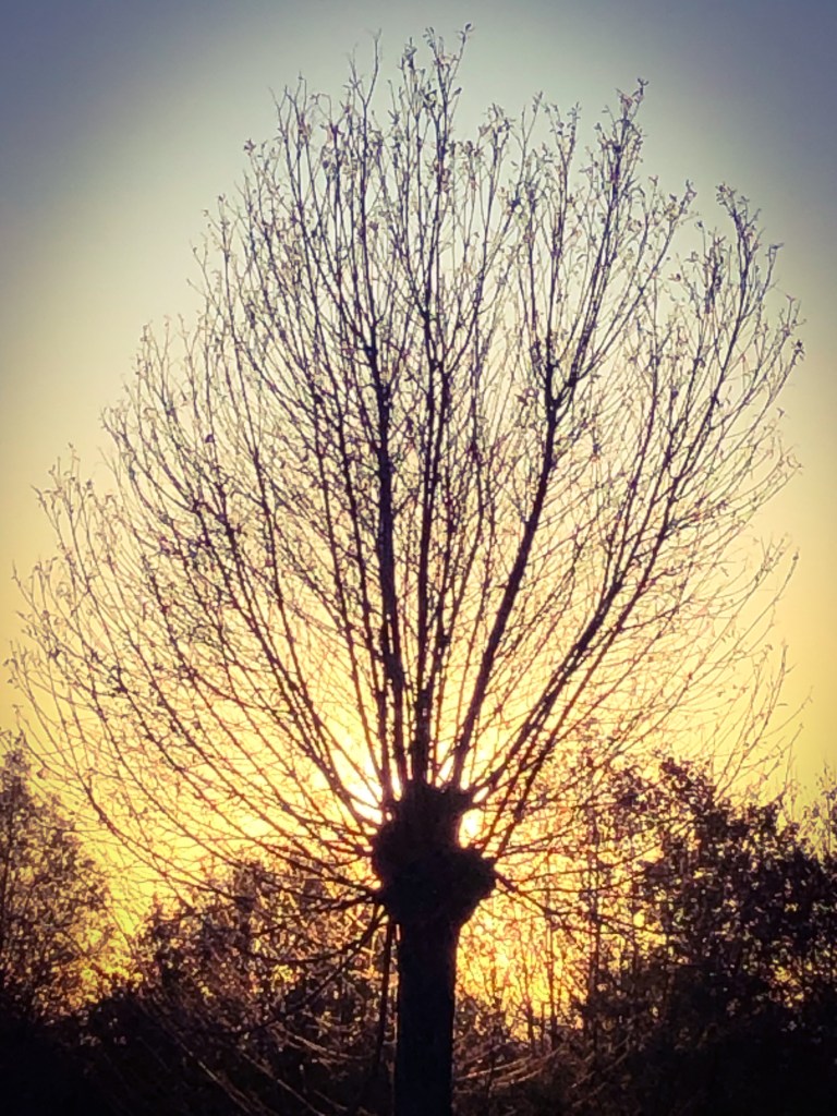I lunghi rami d’albero, spogliati della loro bionda e secca chioma dagli ultimi colpi di vento, nudi ed estesi alla ricerca dei più alti e caldi raggi di sole. Tesi come le corde di un’arpa che, sfiorata dalla fresca brezza al calar del sole, si risveglia, prende coscienza ed inizia a sussurrare al vento le note misteriose di un ciclo di vita naturale. Leggeri soffi di vento ne attraversano i rami, come carezze di dita armoniose tra le corde, creando impercettibili vibrazioni che si disperdono nel silenzio della sera; si diffondono molteplici nell’aria, come cerchi d’acqua in uno stagno colpito da un sasso. Si diffondono note di una sorda ed inebriante armonia emozionale che solo la pelle sembra percepire e che solo le orecchie dell’anima riescono a sentire. Chiudo gli occhi, rimango con i piedi fermi come radici affondate nella terra, statica nella mia eretta posizione, immaginando di essere anch’io un albero e restare in profondo ed attento ascolto dei miei sensi. Ora avverto anch’io lo stesso vento fresco sulla pelle del viso, muoversi confondendosi tra i capelli. Sento le stesse impercettibili vibrazioni, quelle stesse note mute che arrivano trasportate dall’aria, dirette dal cielo, perché in questo preciso momento mi sento connessa in perfetta sintonia della stessa madre Natura. Ne facciamo parte anche noi, sempre, tutti i giorni e le notti. Purtroppo sono rare le volte che viviamo queste magiche sensazioni e che ci ricordiamo di vivere nello stesso unico Universo, prendendone realmente coscienza con grande rispetto ed umiltà.