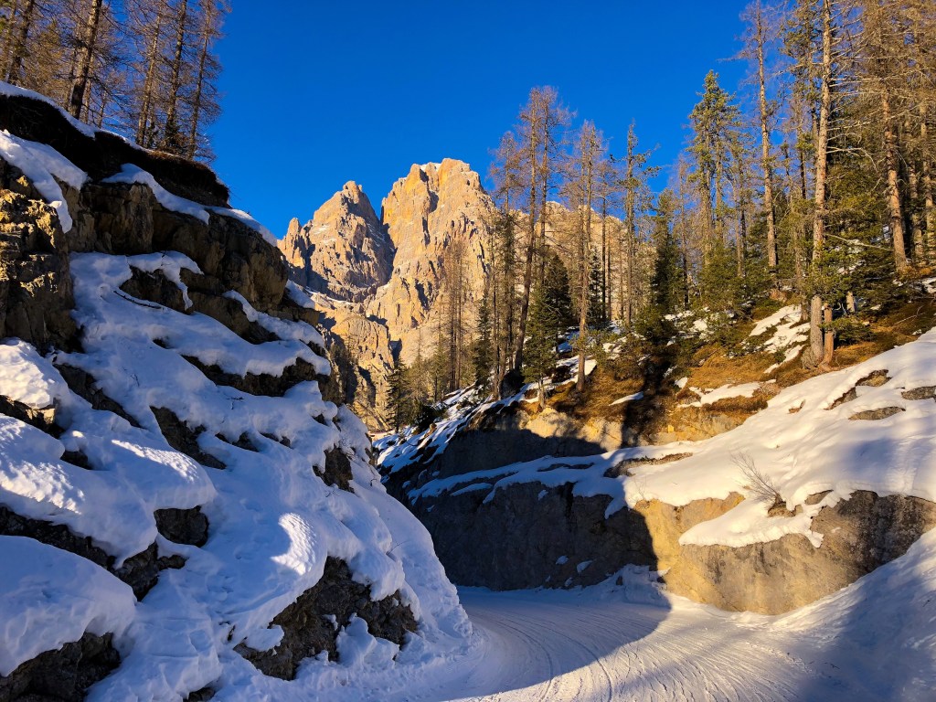 Uno scorcio invernale riscaldato dalla luce dorata di una maestosa parete delle nostre Dolomiti, illuminata dal sole del tardo pomeriggio. Oltre la curva, si svelano le luci di Cortina D’Ampezzo, una preziosa perla racchiusa e protetta tra imperiali ed antiche vette.